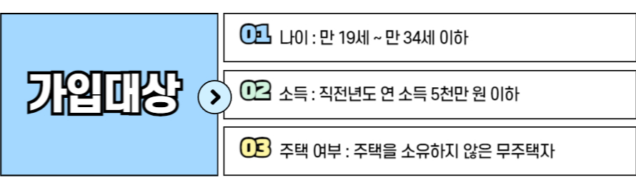(병역증명서에 의한 병역 이행기간이 증명되는 경우 현재 연령에서 병역 이행 기간(최대 6년)을 빼고 계산한 연령이 만 34세 이하인 사람 포함) - 소득 : 직전년도 신고소득이 있는 자로 연소득 5천만 원 이하인 근로, 사업, 기타소득자로 소득세 신고 / 납부 이행 등이 증빙된 자(근로기간 1년 미만으로 직전년도 신고 소득이 없는 근로소득자에 한해 당해 급여명세표 등으로 연소득 환산 후 가입 가능)